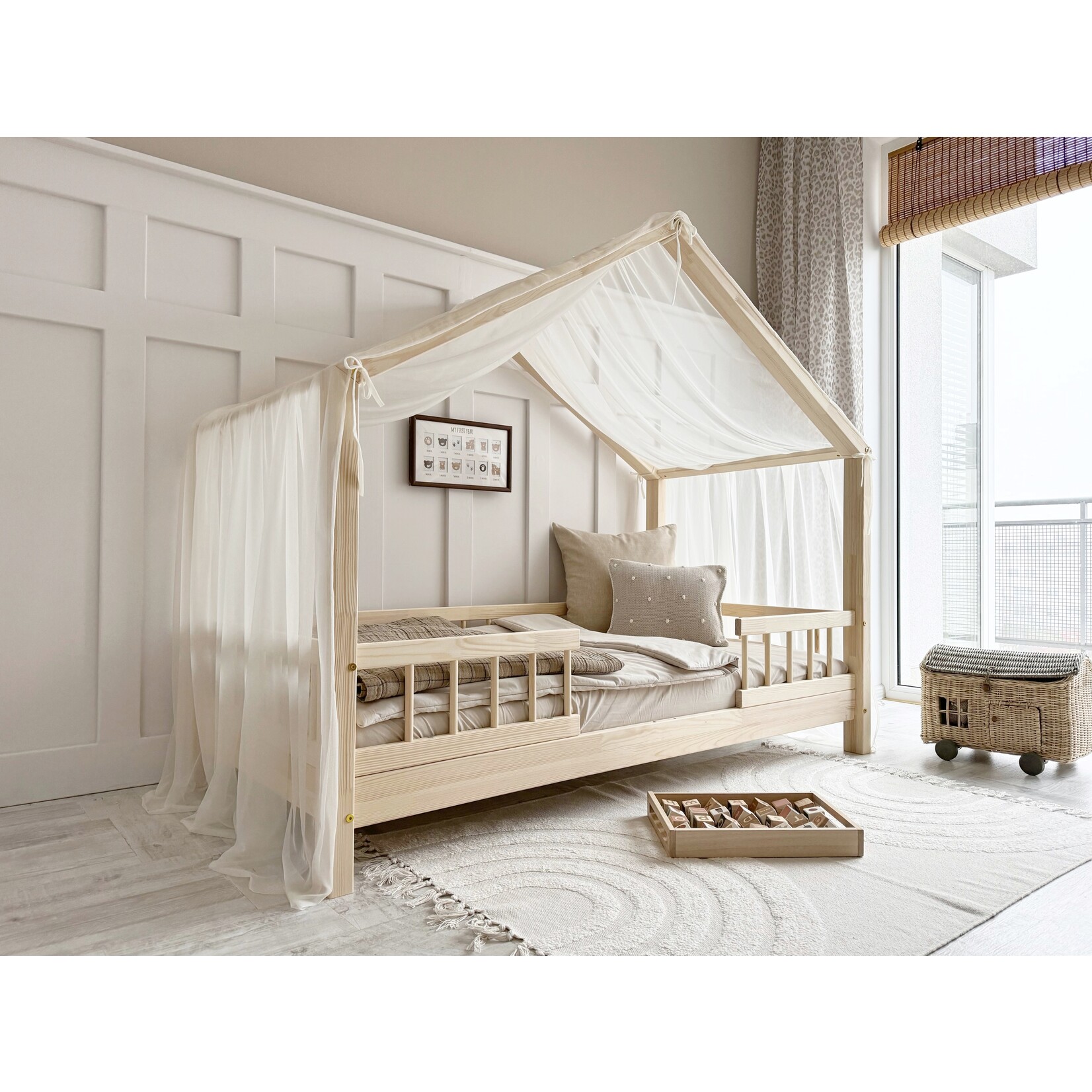 Bedhuis met hekje – een Scandinavisch bedhuis met verwijderbare uitvalbeveiliging. Verkrijgbaar in meerdere maten. Matras en canopy optioneel.