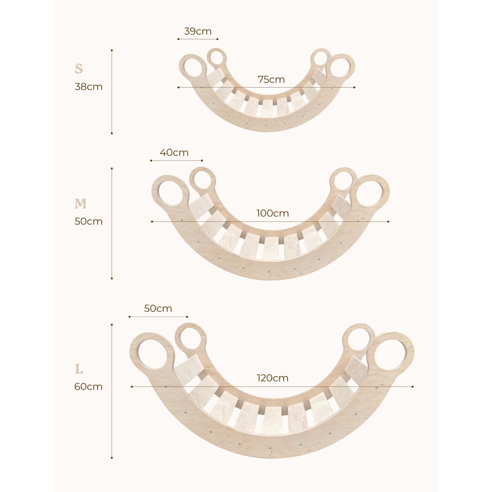 De klimboog is gemaakt van hoogwaardig hout, wat zorgt voor stevigheid en duurzaamheid. De dikke multiplex (15 mm) is niet alleen mooi om te zien, maar ook bestand tegen intensief gebruik. De afgeronde randen beschermen kleine handjes, terwijl handige grepen ervoor zorgen dat kinderen de klimboog gemakkelijk in beweging kunnen zetten of stoppen.